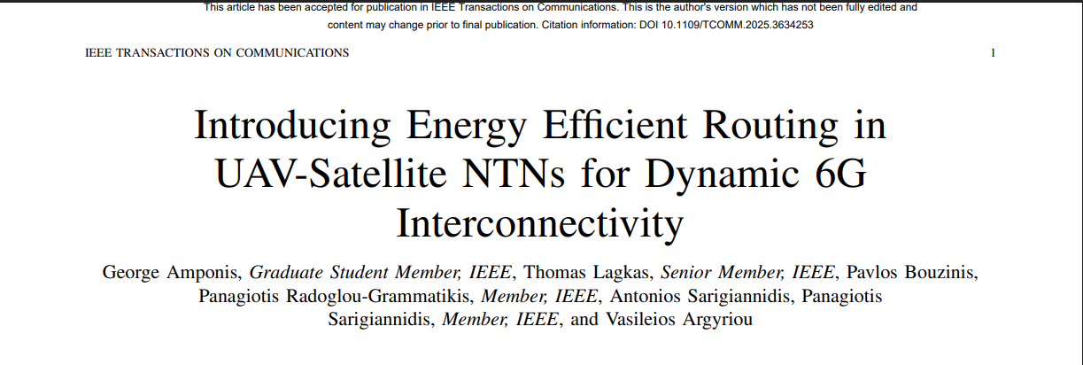 Είμαστε ενθουσιασμένοι και περήφανοι για τη δημοσίευση της έρευνας "Introducing Energy Efficient Routing in UAV-Satellite NTNs for Dynamic 6G Interconnectivity", από τον προσφάτως αναγορευμένο διδάκτορα του, Δρ. Γεώργιο Αμπόνη και τον Διευθυντή του εργαστηρίου Ε.ΒΕ.ΕΣ, Αναπληρωτή Καθηγητή Θω...
